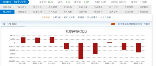 进入2024年,这种状况并未改变,翰宇药业2024年1季度营收约1.5亿元,同比减少约2600万元;净利润亏损约1410万元,去年同期则为盈利1861万元。