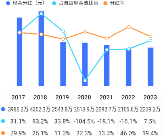 历史年度分红率并不稳定,2023年分红率为19.4%,可以说有些寒酸,也进一步凸显了公司资金面的拮据。