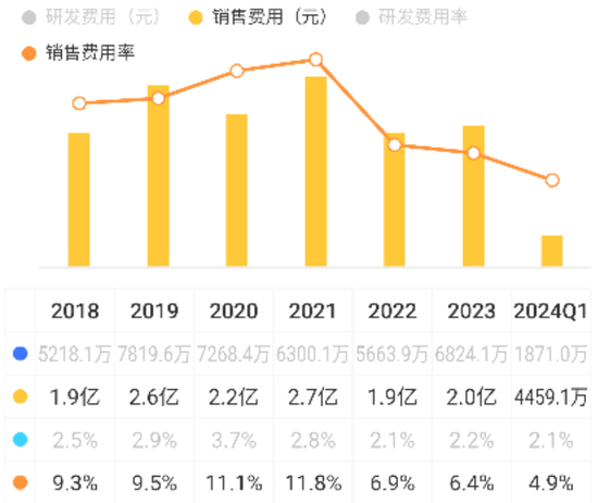 随着品牌业务收缩,2022年公司销售费用也大幅下降,2023年销售费用率降至6.4%。