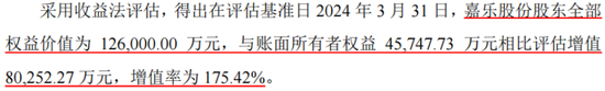 收益法评估下,以2024年3月31日为评估基准日,上海嘉乐100%股权估值为12.6亿元,增值率为175.42%。