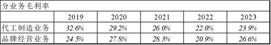 近年来,在聚焦核心品类、优化渠道布局等策略调整下,品牌业务毛利率有一定回升,2021和2023年,品牌业务毛利率反超代工制造业务。