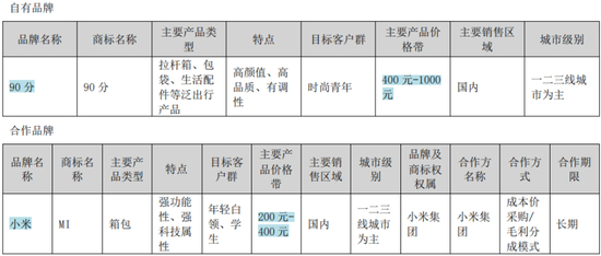 目前,公司经营的品牌包括自有品牌“90分”和合作品牌“小米”,前者定价整体高于后者。