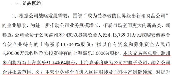 2024年6月,国内箱包代工龙头开润股份(300577.SZ,下称公司)发布公告称,其全资子公司滁州米润公告拟以募集资金及自有现金合计2亿元,收购上海嘉乐15.904%的股份(本次交易)。