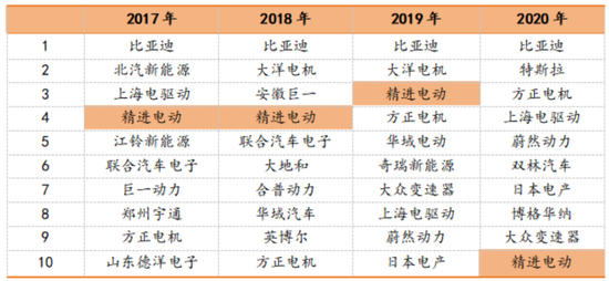 精进电动的国内市场排名也明显后退。2017-2019年还维持在榜单前四甲,2020年便退到了行业第十。