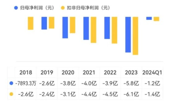 同期利润端更是亏得一塌糊涂,2018年至今累计亏损近22亿元,归母净亏损金额甚至逐年增多,2023年高达-5.8亿元。