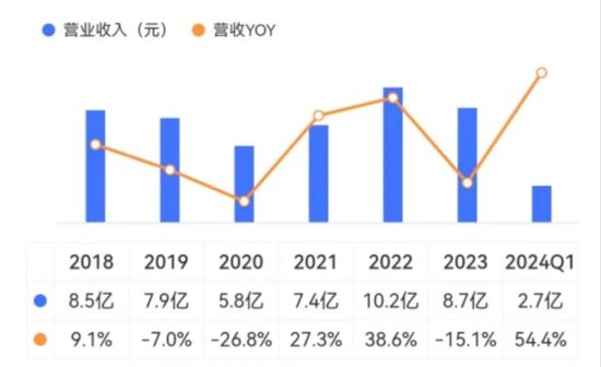 2018-2023年,精进电动的营收规模长期停滞在8亿元上下,最高不过2022年的10.2亿元,2023年又很快缩至8.7亿元,始终没有什么起色。