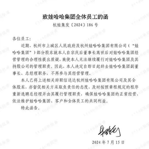 在《致娃哈哈集团全体员工的函》里,宗馥莉称:“杭州市上城区人民政府及杭州娃哈哈集团有限公司部分股东就本人自宗庆后董事长离世后对娃哈哈集团经营管理的合理性提出质疑,致使本人无法继续履行对娃哈哈集团及其持股公司的管理职责。因此,本人决定自即日起辞去娃哈哈集团副董事长、总经理职务,不再参与其经营管理。”落款是她的手写签名,时间是2024年的7月15日。