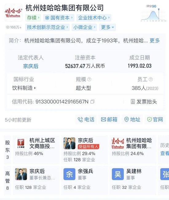 天眼查App显示,娃哈哈集团的直接股东由三方构成,分别为:杭州上城区投资控股集团有限公司持股46%,宗庆后持股29.4%,娃哈哈集团基层工会联合委员会(职工持股会)持股24.6%。而杭州上城区投资控股集团有限公司由杭州市上城区财政局100%间接控制,属于国资。