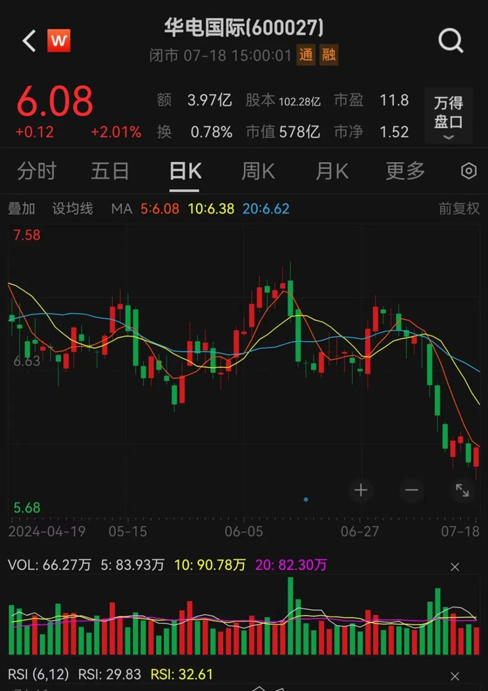 截至7月18日,华电国际股价报6.08元,最新市值为578亿元。其一季末股东有8.3万户。