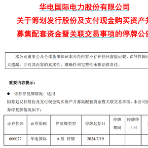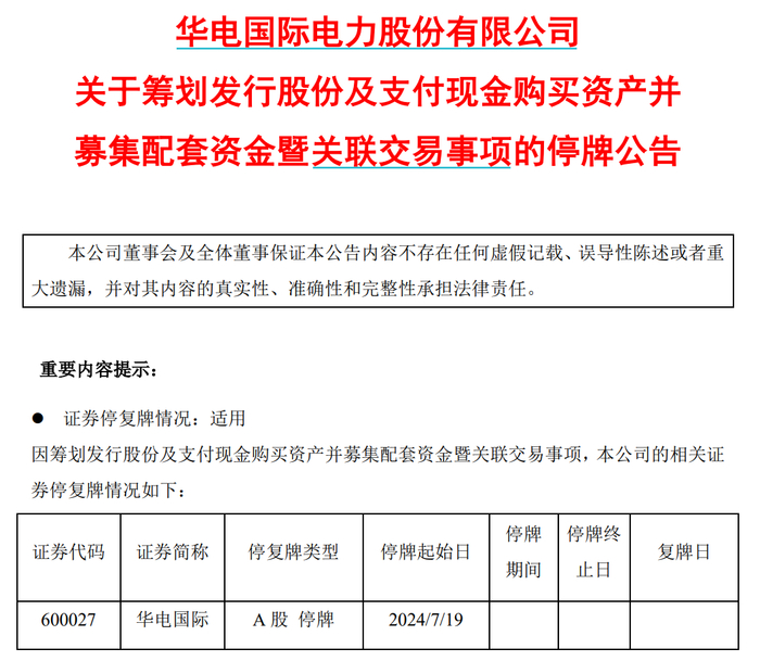 7月18日晚间,华电国际一纸公告宣布,该公司收到控股股东中国华电集团有限公司(以下简称华电集团)通知,拟筹划与公司有关的资产重组事项,其股票于7月19日停牌。
