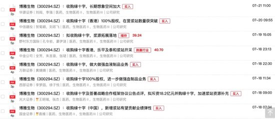而与市场反馈不同,不少券商都对此次收购持看好的态度,并在公告发布后密集发布研报,给出“买入”评级。华源证券认为,“收购绿十字,长期想象空间加大”;万联证券认为,“收购绿十字,做大做强血液制品业务”;国金证券认为,“博雅生物收购绿十字(中国),新增浆站有望贡献业绩弹性”。