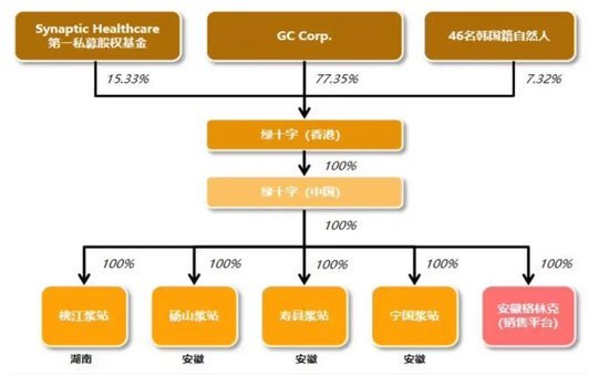 收购前,GC持有绿十字香港77.35%股权,韩国私募股权基金Synaptic持有15.33%股权,46名韩国籍自然人共持有7.32%股权。博雅生物就是通过收购上述股东合计持有的绿十字香港100%股权,从而间接收购境内血液制品主体绿十字。