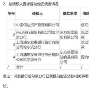 根据东方集团的最新债务公告,到期未偿还的贷款债权人有民生银行北京分行、农业银行方正县支行;要求提前还债的债权人有中国信达、兴业银行哈尔滨分行、浦发银行哈尔滨分行,目前浦发银行哈尔滨分行已经就相关债务向哈尔滨中院提起民事诉讼,该笔贷款本金余额为1.5亿元。