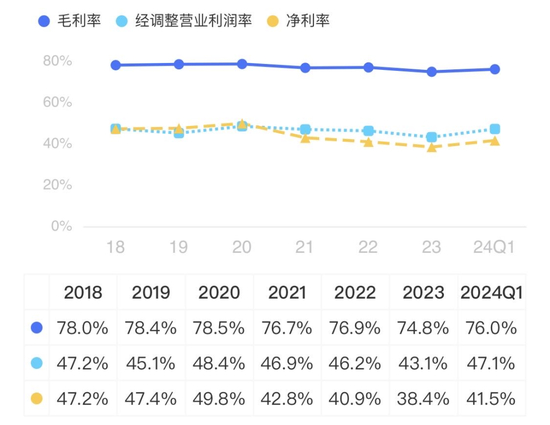 2023年毛利率为74.8%,较2018年仅下降3个百分点,净利率主要受毛利率的影响下降近4个百分点。而归母净利率由于母公司权益份额的减少,2023年较2018年下降9个百分点。