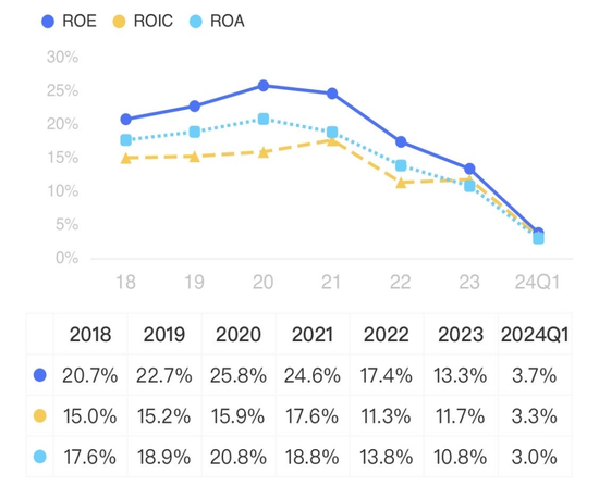 2022年开始,公司的ROE降到20%以下,2023年为13.3%。