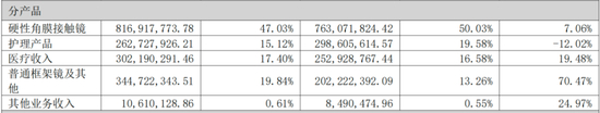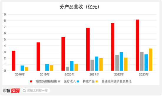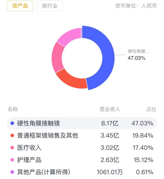 此外与硬性角膜接触镜相配套的护理产品占比为15%,框架镜为20%,剩下的便是医疗服务板块,营收占比17%。