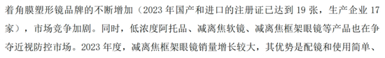刚上市时,公司还是大陆地区唯一获得角膜塑形镜产品注册证的生产企业。但随着角膜塑形镜市场的不断扩大,进入这个领域的品牌不断增加。到2023年,国产和进口的注册证已达到19张,生产企业17家,其中有9家为境内企业。