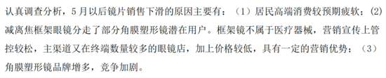 对此公司提到,2023年减离焦框架眼镜的爆火是导致公司OK镜销量增速下滑的一大原因,因为框架镜不属于医疗器械,营销宣传上管控较松,主渠道又在终端数量较多的眼镜店,加上价格较低,具有一定的优势。