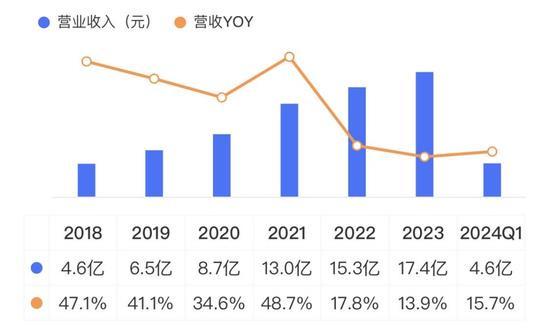2022年开始,营收增速放慢,降至20%以下。到2023年,公司营收17.4亿,今年一季度继续增长15.7%。