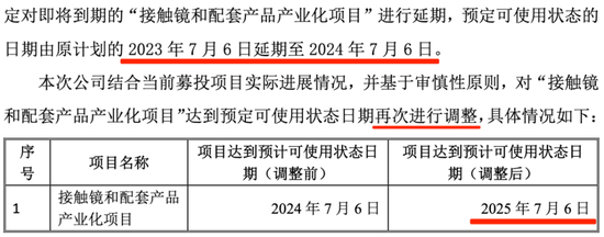 与此同时,拟投资金额占2022年定向增发净募资金额28%的接触镜及其配套产品扩产项目再次延期,目前已延期2年。
