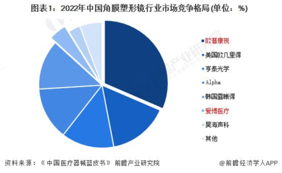 从前膽产业研究院的数据来看,2022年欧普康视以31.5%的份额位列角膜塑形镜市场第一,而2022年公司的角膜塑形镜营收不到8个亿,此外大陆品牌中排第二的为爱博医疗(688050.SH)。