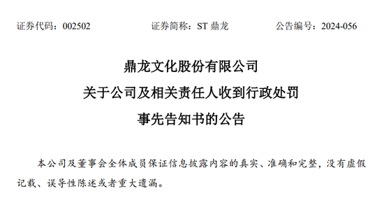 7月31日,鼎龙文化股份有限公司(ST鼎龙,002502)收到广东证监局出具的《行政处罚事先告知书》,寻甸金林为鼎龙文化控股子公司中钛科技的子公司。2021年,寻甸金林虚增钛精矿产量23120.55吨并销售。上述交易标的钛精矿未实际生产,货物未实际交付,销售合同未实际执行,相关经济利益未流入企业。鼎龙文化将上述虚增的存货、营业收入及利润纳入合并财务报表范围,导致披露的2021年年度报告、2022年半年度报告存在虚假记载。其中,2021年度虚增存货958.08万元,虚增利润总额214.72万元;2022年上半年虚增营业收入4577.87万元、虚增利润总额3790.35万元。广东证监局拟对鼎龙文化给予警告,并处以500万元罚款;对5名相关责任人给予警告,分别处以60万元到150万元不等的罚款。