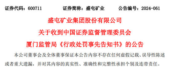 7月31日,盛屯矿业集团股份有限公司(ST盛屯, 600711)收到厦门证监局出具的《行政处罚事先告知书》,盛屯矿业2021年12月至2023年上半年在与有关客户开展钴湿法冶炼中间品销售业务中,存在货物交付给相关客户时控制权并未实质转移而确认收入等行为,导致2021年年报涉嫌多计营业收入3.59亿元,多计利润总额1.94亿元;2022年年报涉嫌多计营业收入0.84亿元,少计利润总额1.39亿元;2023年半年报涉嫌少计营业收入0.78亿元,少计利润总额0.23亿元。厦门证监局拟对盛屯矿业责令改正,给予警告,并处以300万元罚款;对4名相关责任人给予警告,分别处以100万元到150万元不等的罚款。