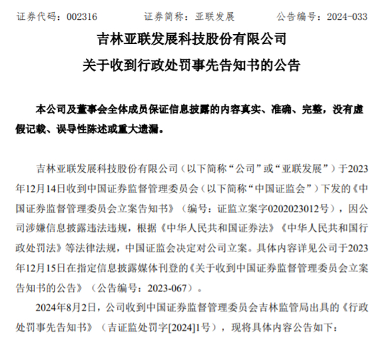 亚联发展公告称,公司8月2日收到吉林证监局出具的《行政处罚事先告知书》显示,监管查明公司涉嫌存在六项违法事实,均与公司原控股子公司开店宝科技集团有限公司(以下简称开店宝)有关。