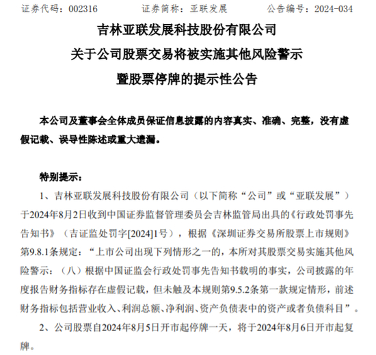 8月4日晚间,亚联发展公告称,公司股票将于8月5日停牌一天,自8月6日复牌起被实施其他风险警示,股票简称变更为“ST亚联”。