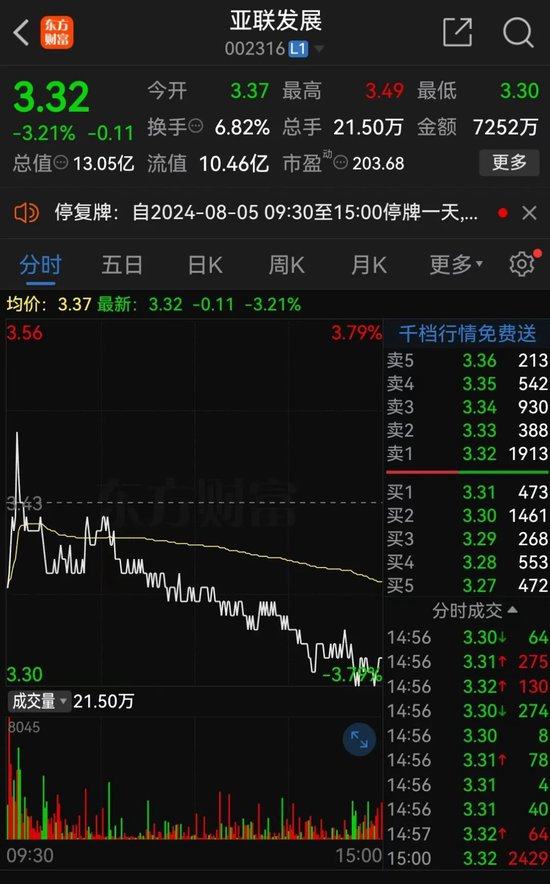 亚联发展将被ST,主要是监管查明其2021年年报存在虚假记载。截至8月2日收盘,亚联发展股价报3.32元/股,总市值为13.05亿元。