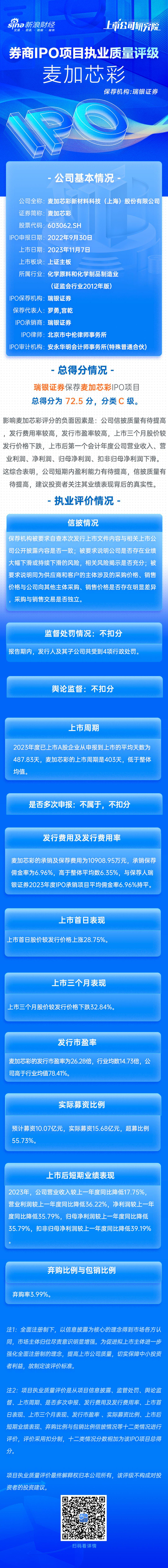 麦加芯彩IPO项目总得分为72.5分,分类C级。影响麦加芯彩评分的负面因素是:公司信披质量有待提高,发行费用率较高,发行市盈率较高,上市三个月股价较发行价格下跌,上市后第一个会计年度公司营业收入、营业利润、净利润、归母净利润、扣非归母净利润下滑。这综合表明,公司短期内盈利能力有待提高,信披质量有待提高,建议投资者关注其业绩表现背后的真实性。