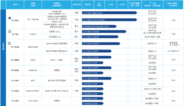 从临床数据看,招股书披露,TY-9591是全球唯一正在进行注册性临床试验为头对头直接比较奥希替尼疗效的EGFR抑制剂。一项临床Ib期结果显示,TY-9591一线治疗EGFR L858R突变的非小细胞肺癌患者,中位PFS为19.3个月,超越了奥希替尼的14.4个月。