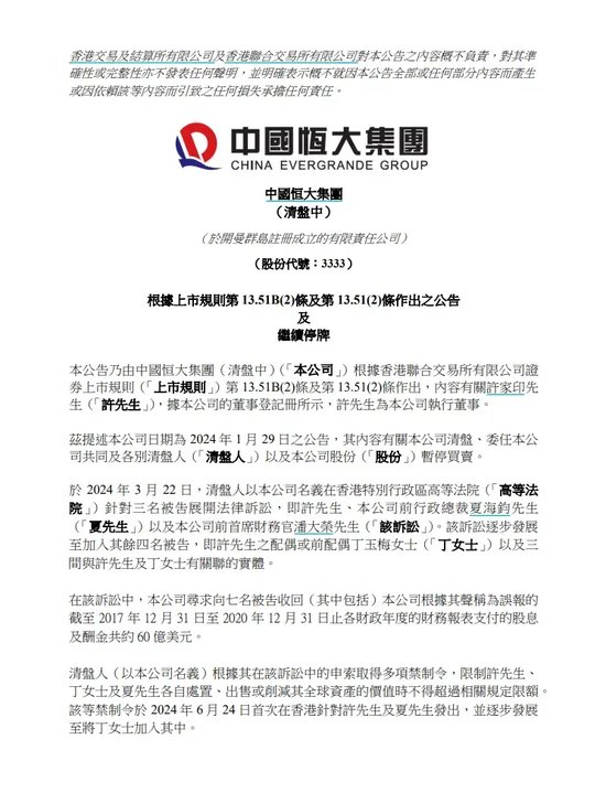 3月22日,清盘人以中国恒大名义,在中国香港高等法院针对三名被告展开法律诉讼,三名被告分别为许家印、夏海钧、潘大荣。随着诉讼进展,许家印配偶或前配偶丁玉梅以及三个与许家印及丁玉梅有关联的实体,也被列入被告名单中。