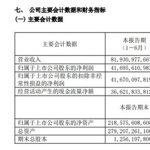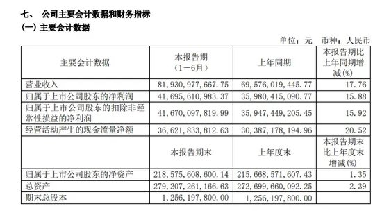 8月8日晚间,贵州茅台(600519)正式发布2024年半年报,今年1~6月,该上市公司实现营业收入819.31亿元,同比增长17.76%;实现净利润416.96亿元,同比增长15.88%;扣非净利润为416.7亿元,同比增长15.92%;经营活动产生的现金流量净额为366.22亿元,同比增长20.52%。