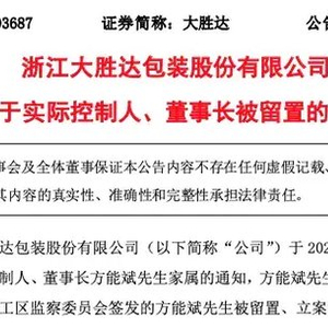 8月13日晚间,大胜达(603687)公告,公司于当日收到实际控制人、董事长方能斌家属的通知,方能斌被洛阳市西工区监察委员会留置、立案调查。