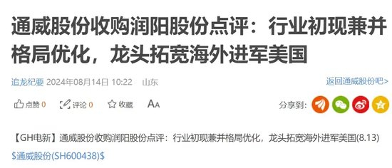 8月13日晚,A股光伏巨头、全球最大电池厂商通威股份公告,将计划通过增资及现金收购等方式,合计取得润阳股份不低于51%的股权,交易总计金额不超过50亿元。如若顺利完成,或将是光伏行业史上最大并购案。