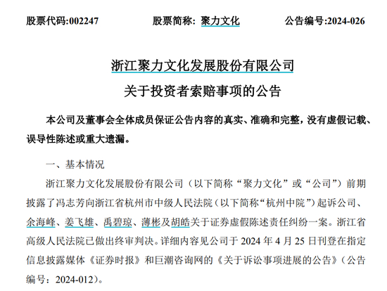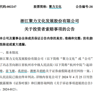 因此,原告冯志芳以公司的虚假陈述行为导致重大投资损失为由,向杭州中院提起诉讼。2023年11月,聚力文化收到杭州中院《民事判决书》,法院对原告投资者冯某诉聚力文化、余海峰、姜飞雄、禹碧琼、薄彬及胡皓关于证券虚假陈述责任纠纷一案作出了一审判决。