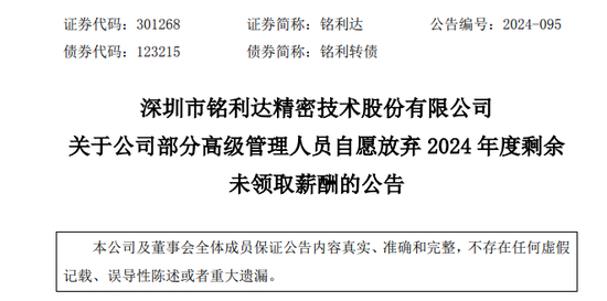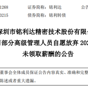 8月20日晚间,铭利达发布公告称,为表明与公司共度危机的决心,总经理陶诚和副总经理张贤明自愿放弃2024年7月1日至2024年12月31日期间在公司领取的薪酬。