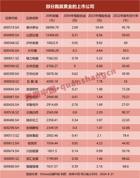 珠宝首饰行业的老凤祥2004年每股收益为0.053元,2023年的每股收益为4.23元,20年每股收益增加了79倍,该公司的股利支付长期稳定在40%以上。该公司的股价在过去20年涨幅也在20倍左右,远远跑赢黄金。
