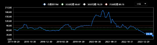 但随着上涨行情结束,爱尔眼科的估值拐点出现,该公司开启了一轮估值调整行情。爱尔眼科最新市盈率(TTM)不到24倍,已跌至近10年30分位值(66.67倍)以下。