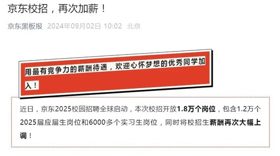 去年9月,京东2024届校招拿出1.5万个岗位,同样是“行业最大规模”。