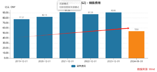 在这种模式下,三七互娱的销售费用居高不下。2019年至2023年及2024年半年报,公司总营收合计为860.28亿元,而同期销售费用则高达482.59亿元,销售费用占营收近六成。