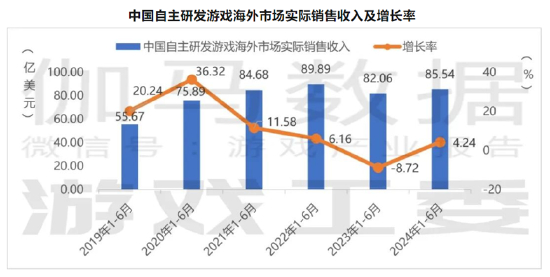 2024年1—6月,中国自主研发游戏海外市场实际销售收入为85.54亿美元,同比增长4.24%,主因是部分新上线产品出现爆款,带来明显增量。