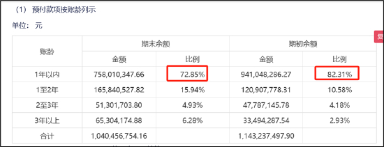 颇为疑惑的是,公司的一年以上的预付款占比进一步大幅上升。年初一年以内的预付款占比为82.31%,今年半年报末则占比为72.85%。换言之,公司一年以上预付款占比大幅攀升,对应金额近3亿元,其中三年以上预付款超6500万元。
