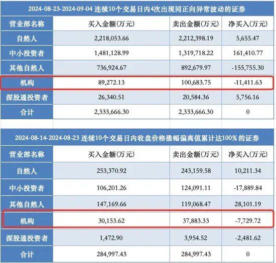 Wind数据显示,在8月14日—8月23日、8月23日—9月4日,自然人分别净买入1亿元、5655万元;机构分别净卖出7730万元、1.14亿元。其中,8月23日—9月4日,中小投资者大举净买入超16亿元。