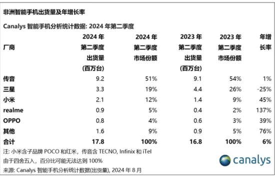 其中,在大本营非洲市场,公司在2024年Q1智能手机出货量为950万台,同比增长36%,市场份额为52%,排名第一;Q2的出货量920万台,同比增长1%,市场份额为51%,较上年同期的54%相比出现下滑。