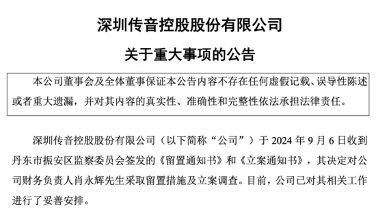 消息面上,传音控股于前一个交易日(即9月6日)盘后发布公告,称公司收到丹东市振安区监察委员会签发的《留置通知书》和《立案通知书》,决定对公司财务负责人肖永辉采取留置措施及立案调查。目前,公司已对其相关工作进行了妥善安排。