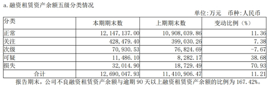 同时公告还披露,报告期末,公司不良融资租赁资产余额与逾期90天以上融资租赁资产余额的比例为167.42%。
