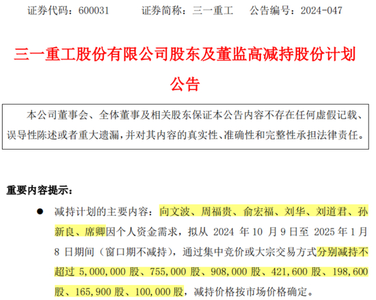 9月6日盘后,三一重工突发公告称:向文波、周福贵、俞宏福、刘华、刘道君、孙新良、席卿这7位股东,拟从今年10月9日至2025年1月8日期间,合计减持不超过754.91万股(占公司总股份的0.089%)。