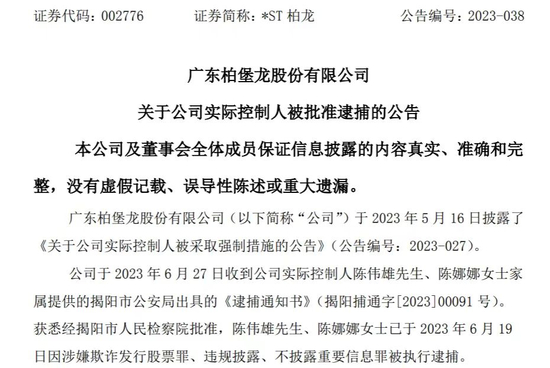2023年6月,柏堡龙披露关于公司实际控制人被批准逮捕的公告。